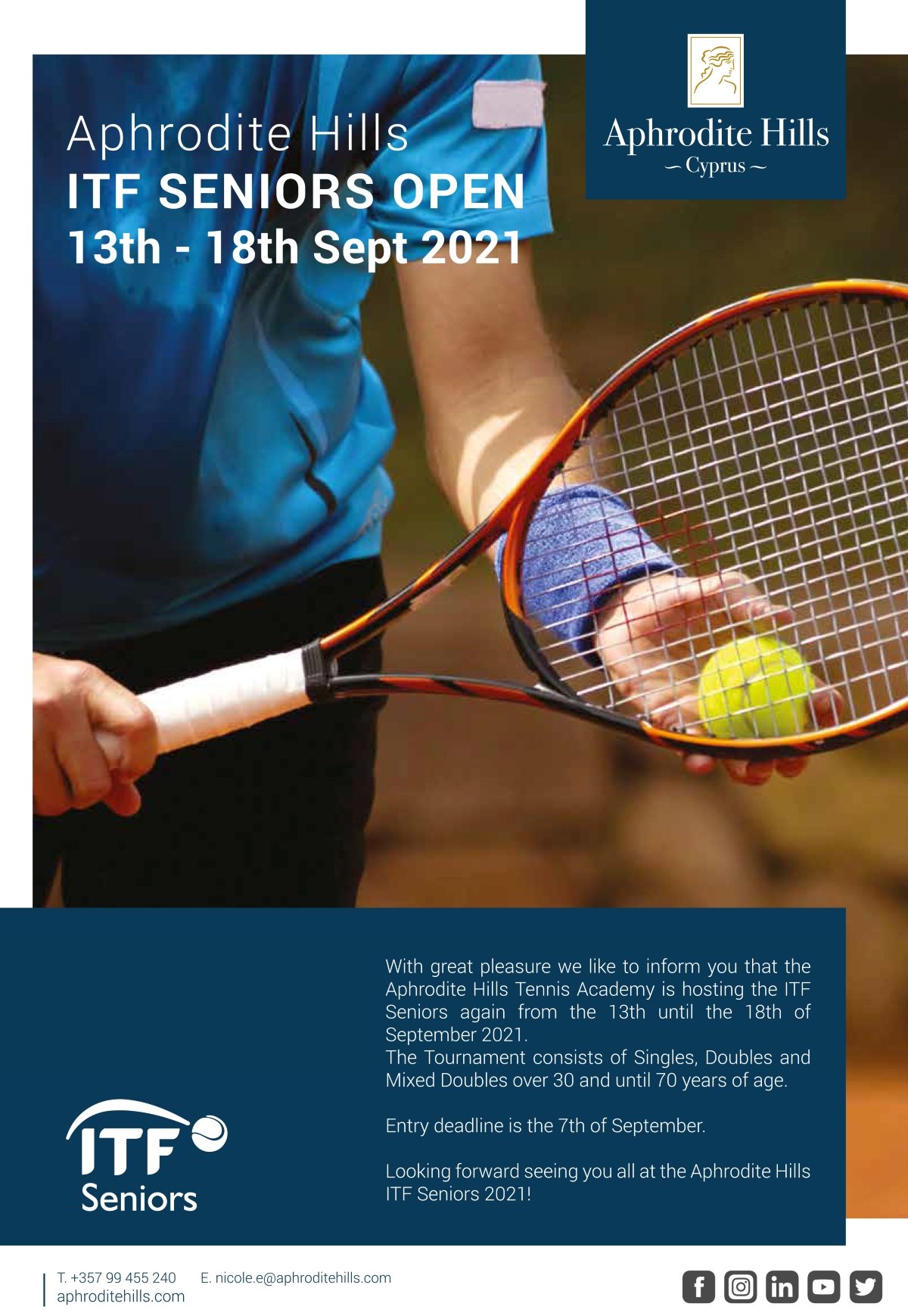 Aphrodite Hills Tennis Academy is hosting the ITF Seniors again from the 13th until the 18th of September 2021.