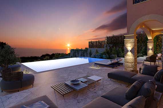 The natural landscape is conserved using hedges for plot subdivisions and preservation of existing site features, including limekilns, stone walls, scree slopes and rock outcrops. The exterior aesthetic of the Resort’s development is magically combined with dramatic sea views.