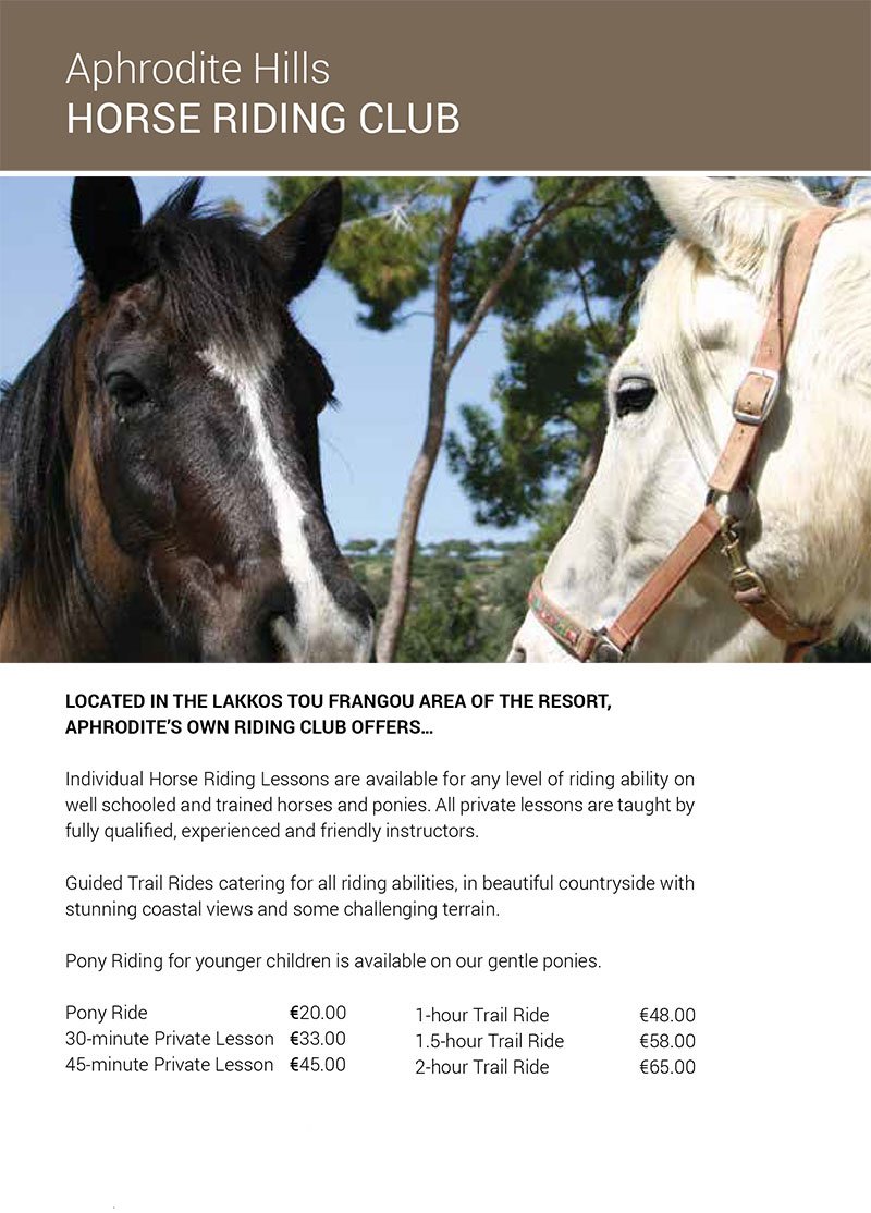 Клуб верховой езды Афродита Хиллс предлагает Вам исследовать прекрасный лесной ландшафт Лаккос Ту Франгу, расположенный недалеко от северного конца курорта. Поездка доступна гостям любых возрастов и уровня подготовки. Наш клуб предлагает индивидуальные занятия для новичков и опытных наездников; поездку по живописным природным ландшафтам; Клуб пони, где дети могут посещать конюшни, чтобы поближе познакомиться с верховой ездой и особенностями ухода за пони. Возле конюшен расположена большая открытая площадка.